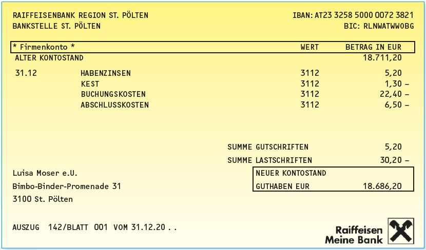 Verbuche die übrigen Posten der Abschlussrechnung der Raiffeisenbank.