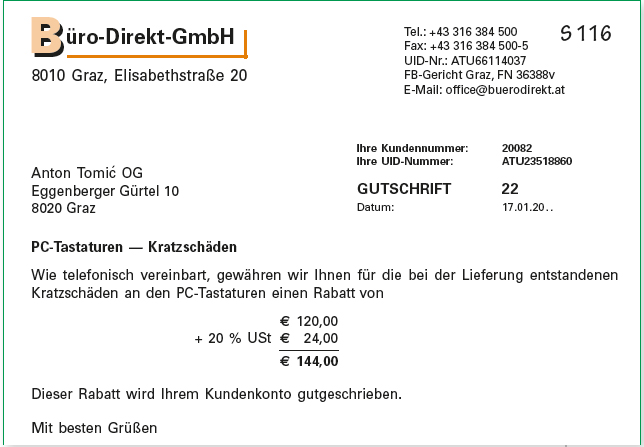 16.1. S 110 Der Lieferant Vertriebs-GmbH (33009) gewährt einen nachträglichen Rabatt für schadhafte Ordner über € 68,40 (inkl. 20 % USt).