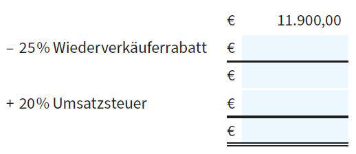 21.1. E 213 Wareneinkauf von Toner und Tintenpatronen für verschiedene Drucker bei der Huber & Skala KG (33042) um € 19.500,00 – 25 % Wiederverkäuferrabatt + 20 % Umsatzsteuer